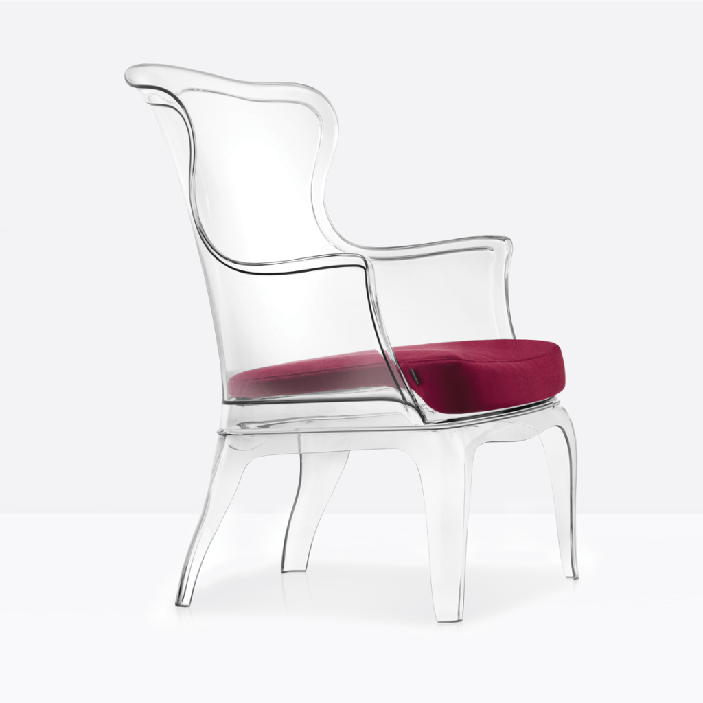 Poltroncina lounge, naturale estensione della poltrona, in polipropilene caricato con fibra di vetro, adatta sia per indoor che outdoor. La struttura dello schienale forma nella parte alta una grande maniglia che ne facilita il sollevamento e lo spostamento e le conferisce un distinto carattere. Grazie alla forma affusolata delle gambe appare leggera ed elegante, pur essendo robusta e indeformabile.