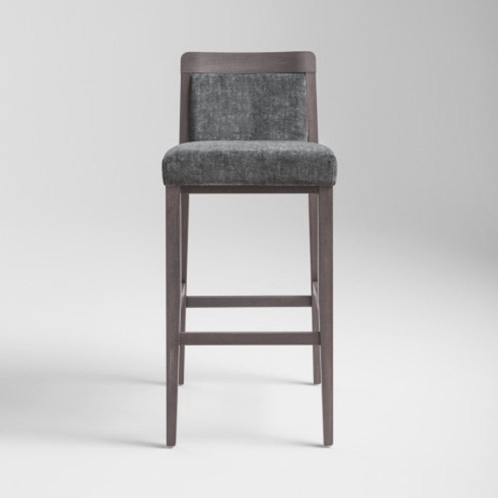 Sgabello con seduta e schienale in polipropilene. Telaio in pressofusione d’alluminio verniciato o cromato. Altezza seduta 750 mm